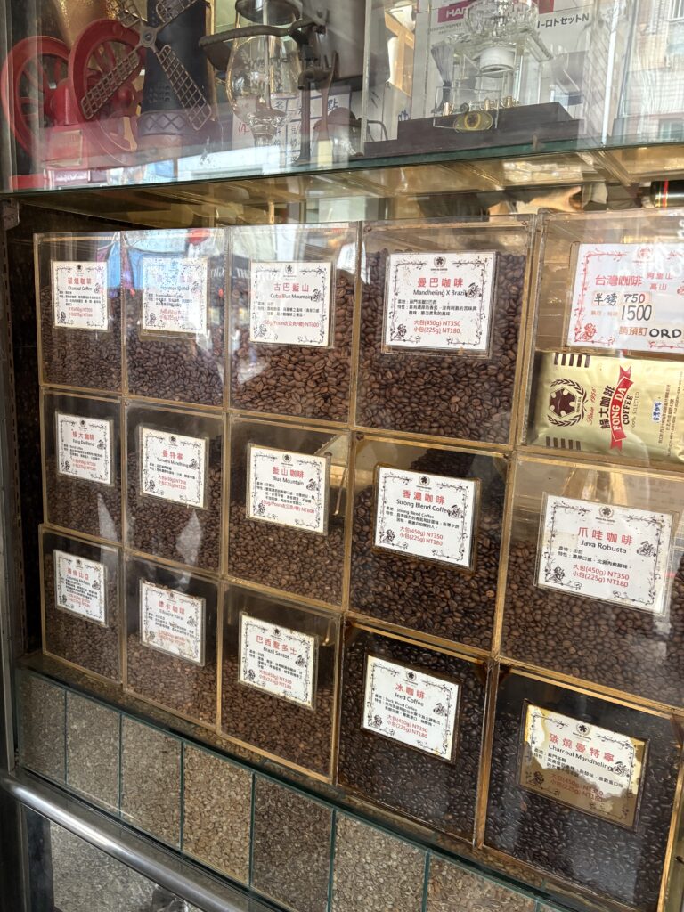 西門駅を出てすぐ、成都路を歩くと、店先に並ぶ巨大なガラス瓶とレトロな焙煎機が目に飛び込んできます。